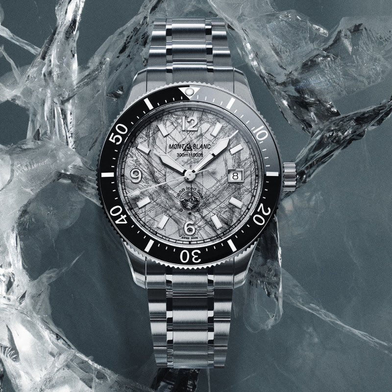 Apresentado como o primeiro relógio de mergulho esportivo da Montblanc, o Montblanc 1858 Iced Sea Automatic Date Cinza abriga um fascinante mostrador inspirado no Mer de Glace, a principal geleira do maciço do Mont Blanc, com uma textura de profundidade alcançada com uma técnica especial chamada gratté- boisé.