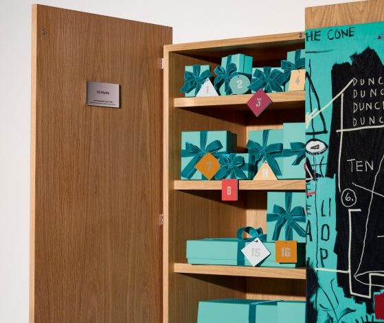 O design do calendário lembra um gabinete de curiosidades, revelando 24 Blue Boxes repletas de joias e objetos da Tiffany. Inspirando-se na linguagem visual e nos subtextos do estilo de Basquiat, o Calendário do Advento é detalhado com elementos de design que homenageiam seu prolífico trabalho. Nos primeiros anos de sua carreira, Basquiat pintou objetos do cotidiano como janelas, portas e geladeiras, recontextualizando objetos em papelão, compensado e outros materiais. Uma homenagem ao uso de meios não convencionais pelo artista, as portas do Calendário do Advento são feitas de carvalho branco de mais de um metro. Composto por equações matemáticas, textos, figuras, gestos expressivos e símbolos, a obra de arte exemplifica sua abordagem crua, mas metodológica de seu ofício.